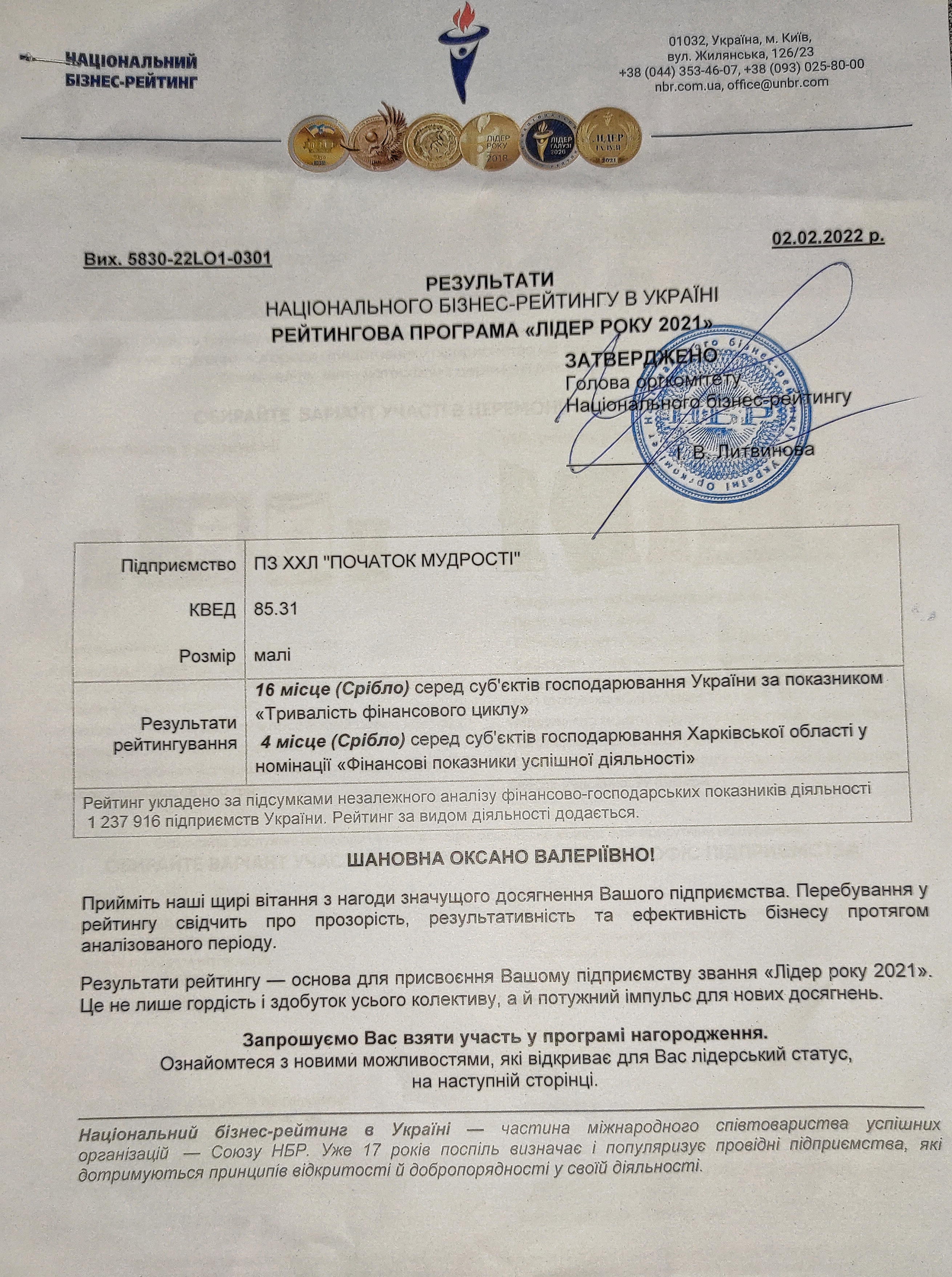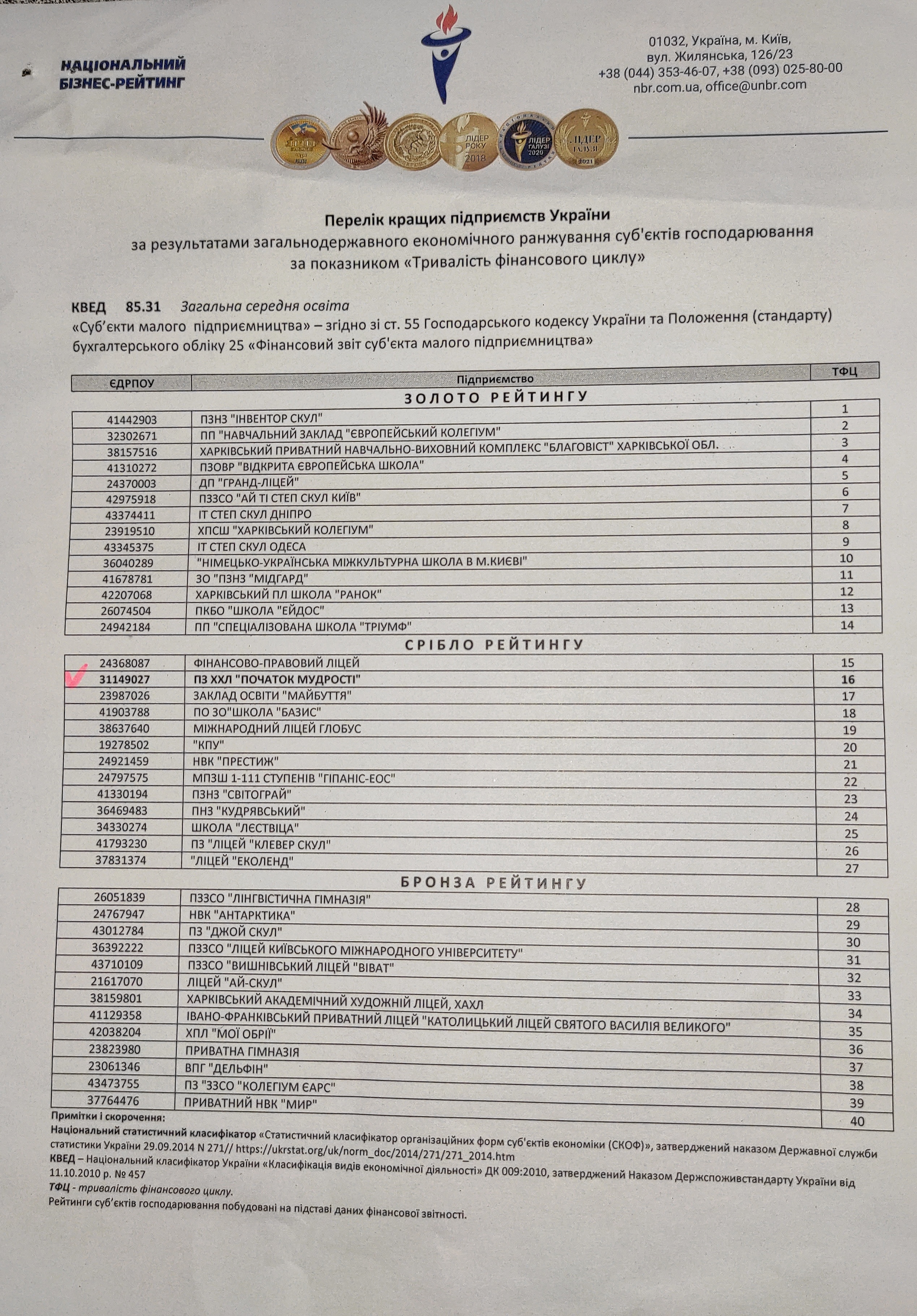 Приватний заклад "Харківський християнський ліцей "Початок мудрості" посів 16 місце (срібло) серед суб'єктів господарювання України за показником "Тривалість фінансового циклу" та 4 місце (срібло) серед суб'єктів господарювання Харківської області у номінації "Фінансові показники успішної діяльності".