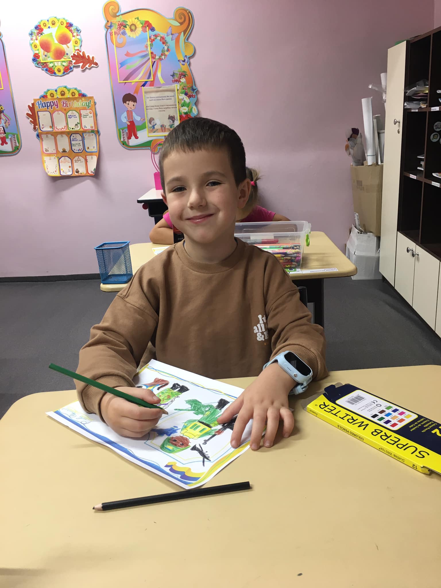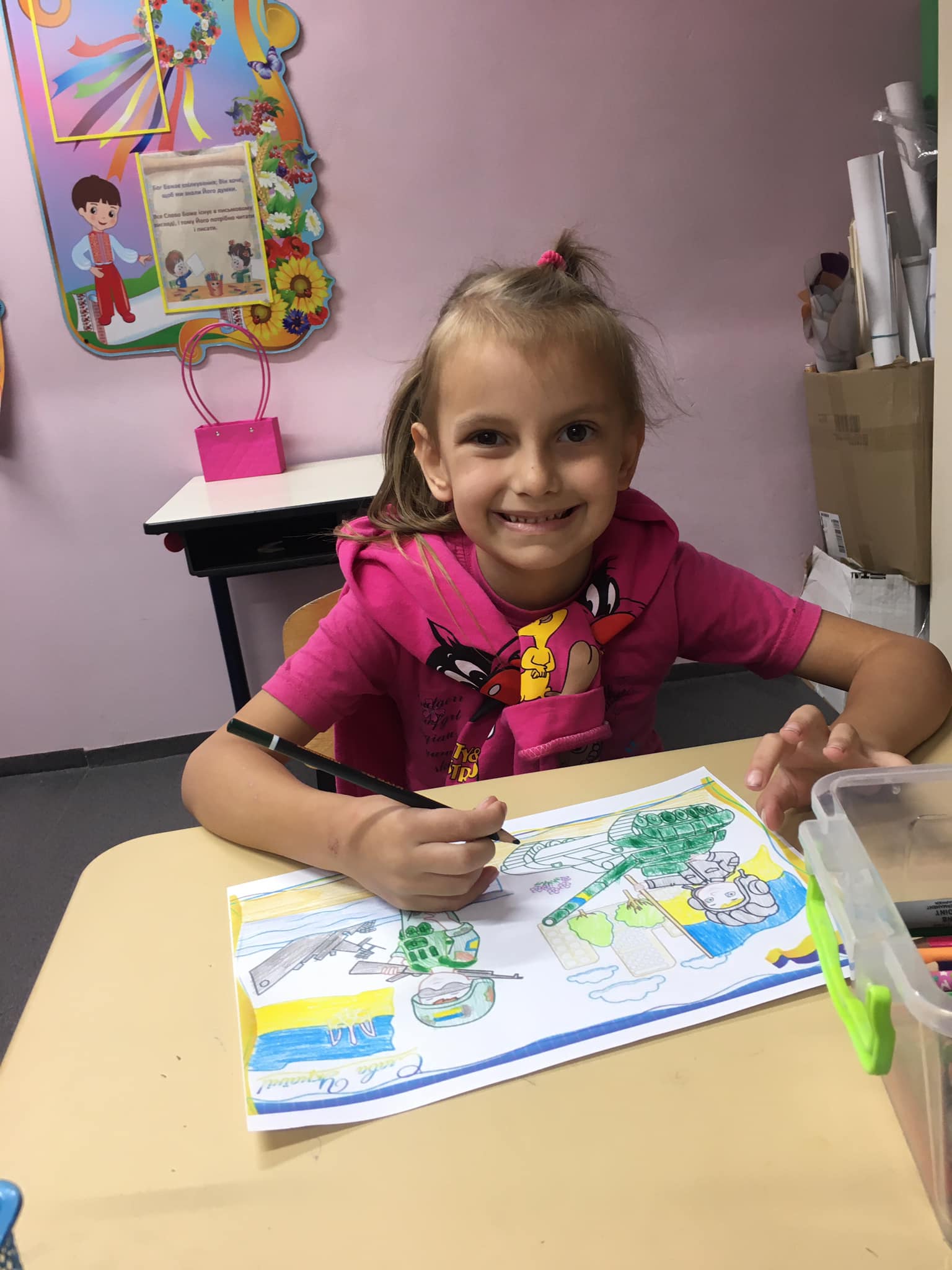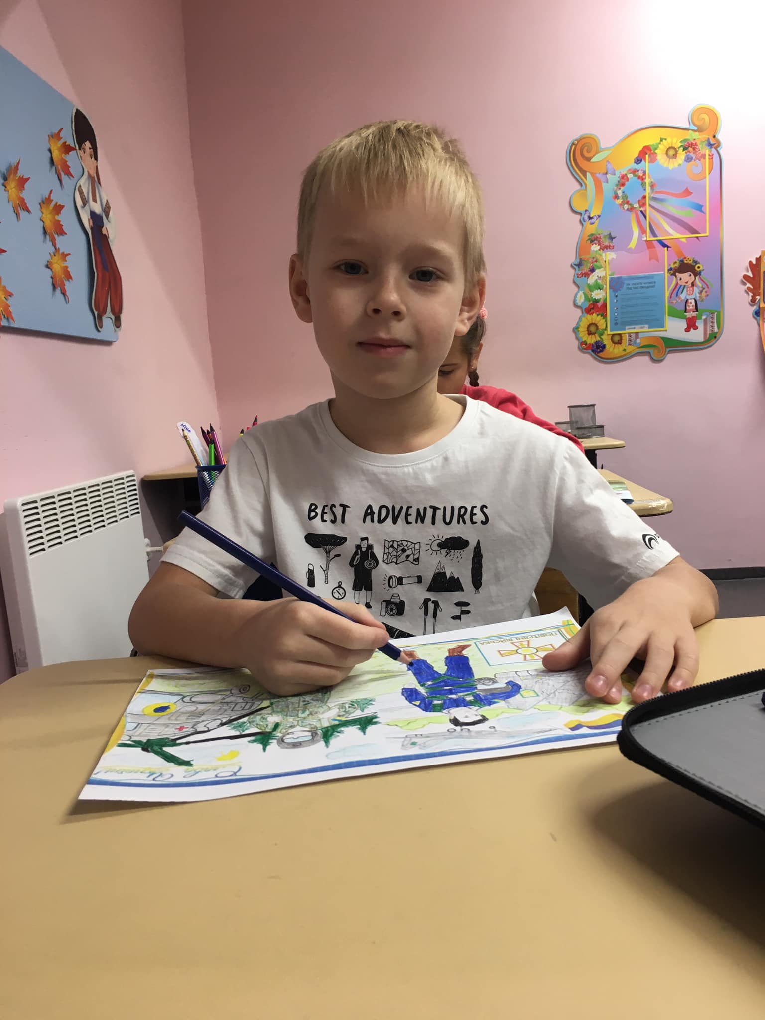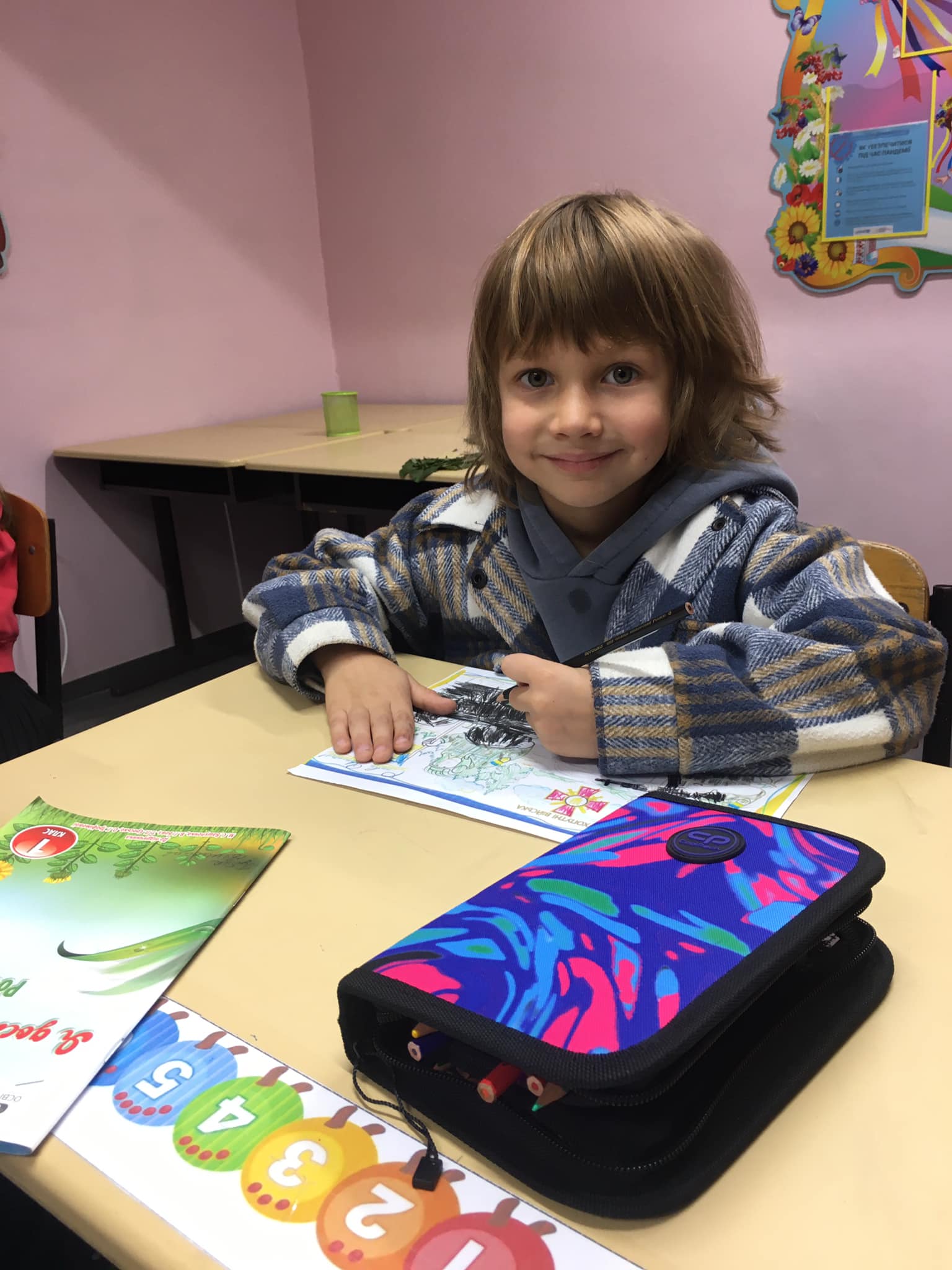 П'ятикласники намалювали чи принесли квіти , щоб привітати свою однокласницю, яка знаходиться так близько до війни, в одному з районів, де близько йдуть бойові дії, аби хоча б вона посміхнулася. І вона таки всміхається!!!