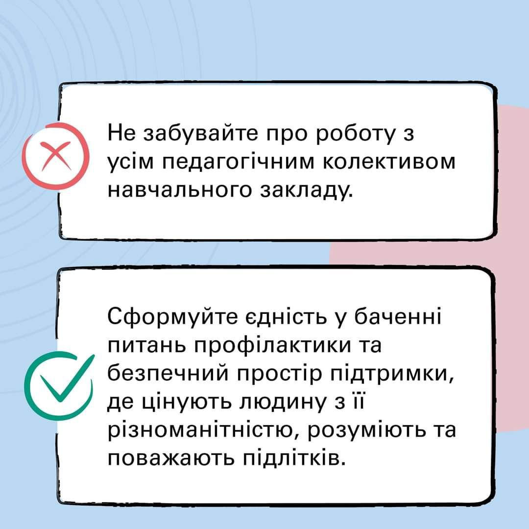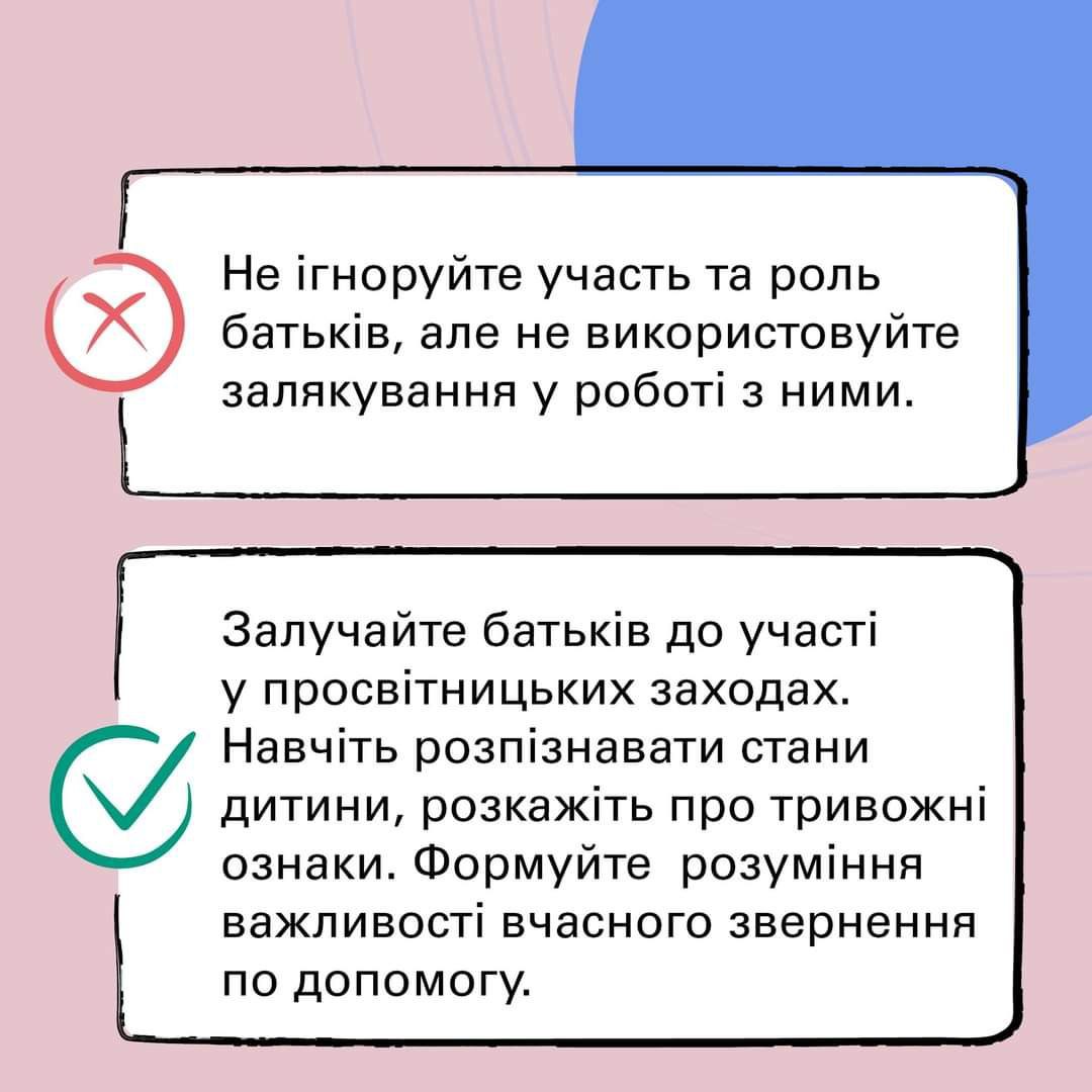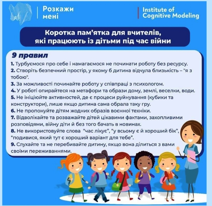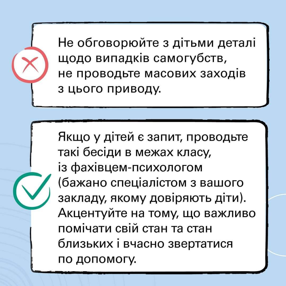 - Якщо вам відомо, що в одного з учнів відбулась жахлива травмуюча подія, не розпитуйте про це детально. Повторення деталей може викликати повторну травматизацію психіки. Також пам’ятайте, що якщо хтось ділиться страшними подіями в групі – це може сприяти травматизації інших слухачів. Якщо у дитини є потреба поділитись, за можливості, краще запропонувати їй поспілкуватись після уроку індивідуально, або спрямувати цю роботу на психолога.